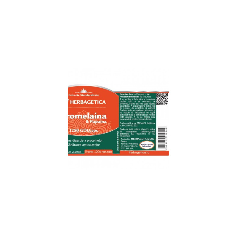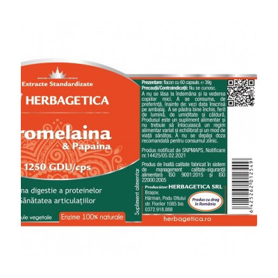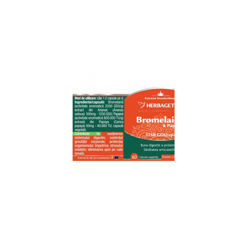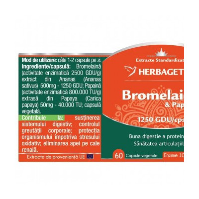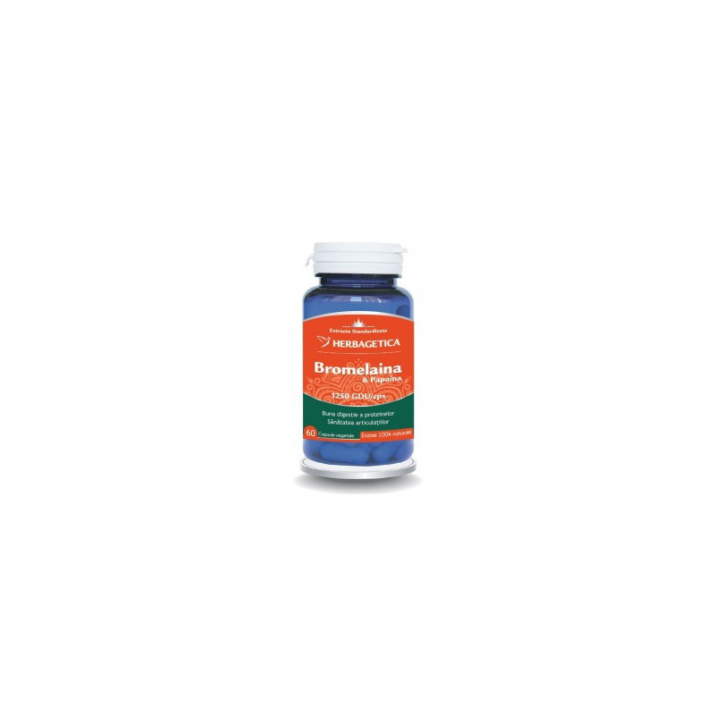 Produsul Bromelaina&Papaina conţine un mix intens de enzime proteolitice specializate în descompunerea proteinelor din alimente. Bromelaina&Papaina conține enzime digestive din surse 100% naturale: Bromelaină 1250 GDU/capsulă extrasă din Ananas și Papaină 40.000 TU/capsulă extrasă din Papaya. . |