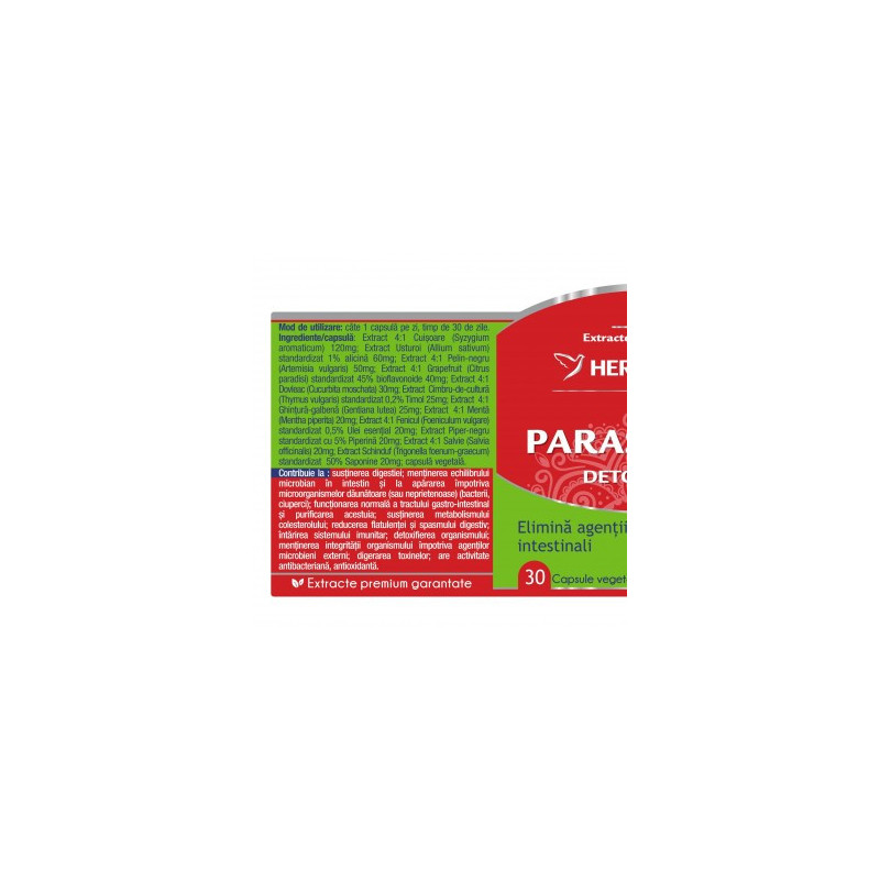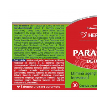 Parasites 12 Detox Forte este o formulă originală, 100% naturală, ce conține 12 extracte forte din plante medicinale cu rol antiparazitar. Este un puternic detoxifiant intestinal ce ameliorează senzațiile neplăcute cauzate de prezența paraziților, reface flora intestinală și îmbunătățește producția de anticorpi.