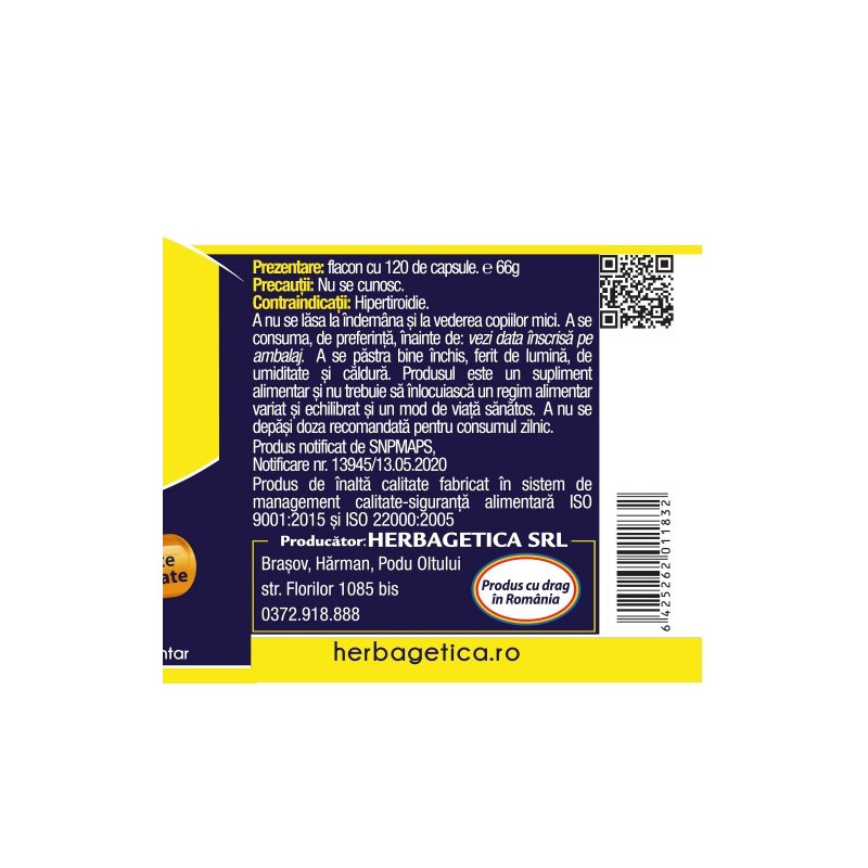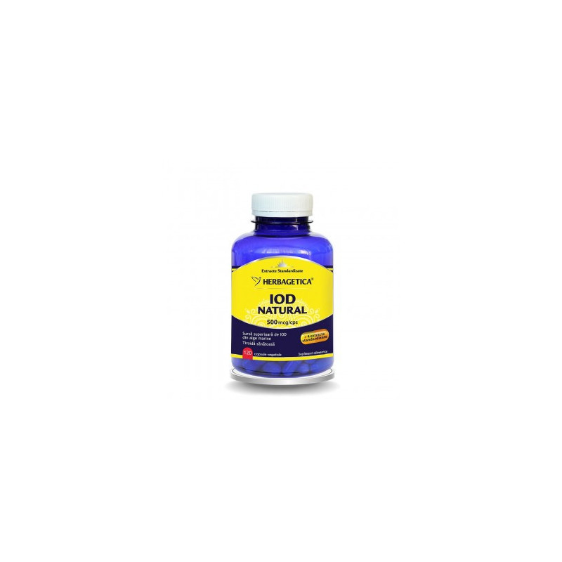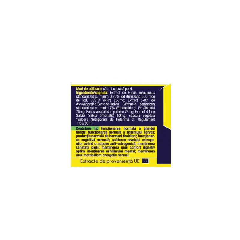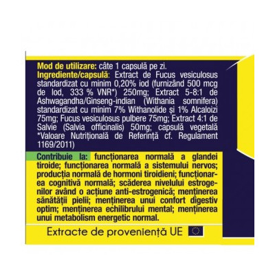 Produsul Iod Natural asigură un sprijin esențial al dietei noastre, furnizând o concentrație ridicată de 500 mcg/capsulă de Iod, asigurând 333.33% din necesarul zilnic de Iod. Extras dintr-una din cele mai bogate surse naturale de Iod, Alga Fucus, produsul Iod Natural livrează o concentrație ridicată de Iod, într-o formulă perfect asimilabilă de către tiroidă. Formula de Iod cu extractele de Ashwagandha și Salvie reglează activitatea glandei tiroide.