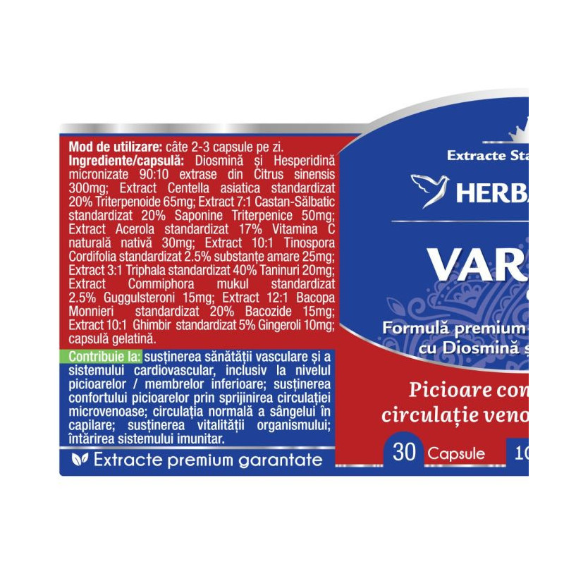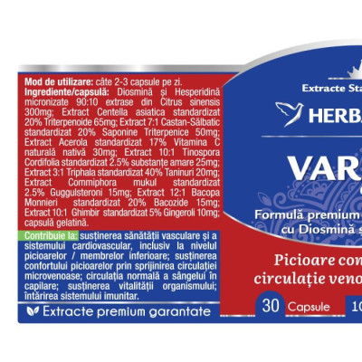 Varicin Complex susține fluxul sanguin și funcționarea optimă a venelor, capilarelor și vaselor limfatice prin extractele de Diosmină și Hesperidină, Gugul, Gotu Kola, Brahmi, Castan, Ghimbir, Giloy și Vitamina C. Extractele din compoziție stimulează producția de elastină și colagen pentru a întări țesutul conjunctiv și pereții venelor, cresc numărul total de capilare limfatice, crescând fluxul de drenare al fluidelor. În plus, refac elasticitatea pereților venelor și îndreaptă venele răsucite din picioare.