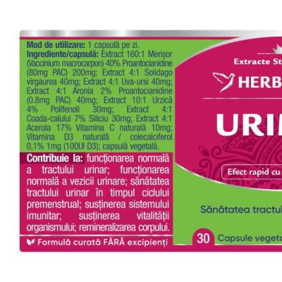 Extractul de Merișor (Vaccinium macrocarpon) standardizat 160:1 cu 80 mg PAC/capsulă contribuie la eliminarea bacteriilor din tractul urinar.
