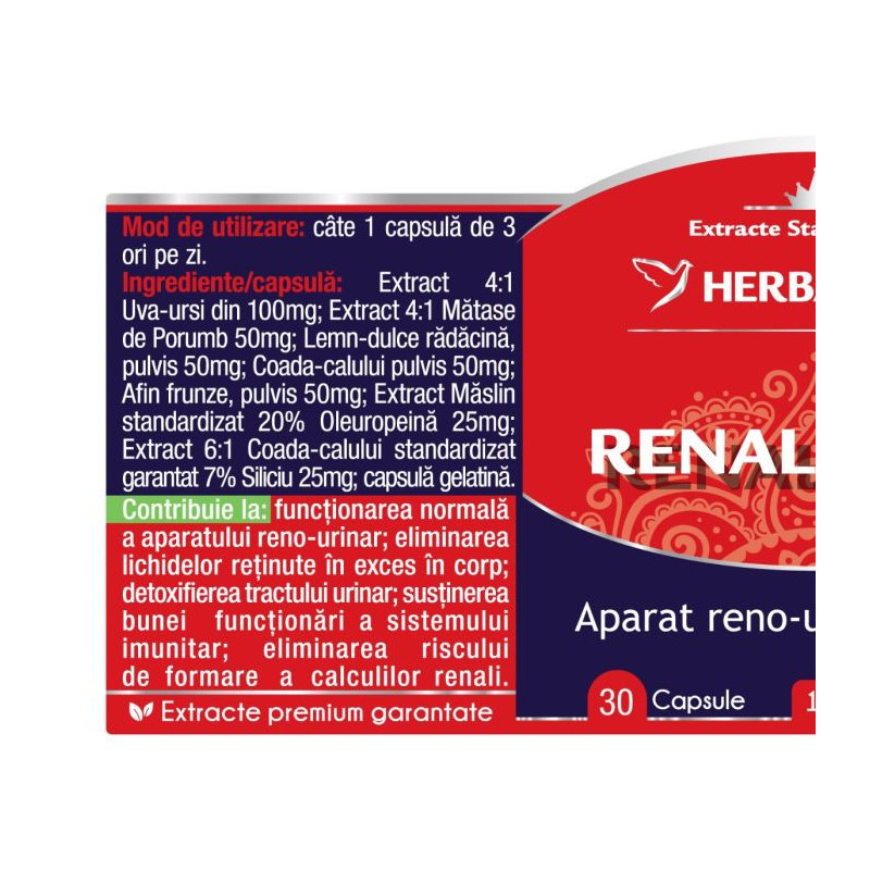 Renal Forte are în componenţa sa plante dedicate sistemului reno-urinar cu acțiune antibiotică, antivirală, diuretică şi antiinflamatoare, care îi menţin sănătatea.