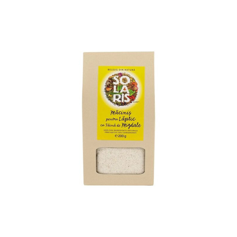 Macinis pentru Laptic cu Faina de Migdale 200 g Solaris este un amestec din faina de migdale (30%), fulgi de grau, fulgi de secara, fulgi de orz, fulgi de ovaz, fulgi de mei, fulgi de porumb fara zahar adaugat (malai grisat 88%, malt de orz, sare), fulgi de orez, fulgi de hrisca.
