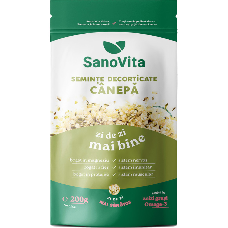 Semințe decorticate de cânepă. Poate conține urme de: gluten, arahide, fructe cu coajă lemnoasă, muștar, susan, soia.